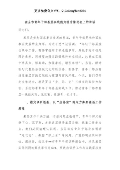 【七哥公文】2025年:【七哥公文】在全市青年干部基层实践能力提升推进会上的讲话+更多免费公文+VX:QiGeGongWen2024+更多免费公文+VX:QiGeGongWen2024