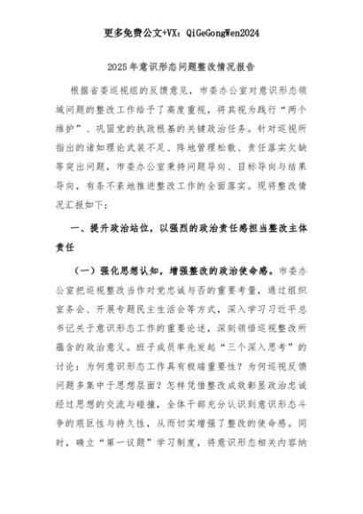 【七哥公文】2025年:【七哥公文】2025年意识形态问题整改情况报告+更多免费公文+VX:QiGeGongWen2024+更多免费公文+VX:QiGeGongWen2024