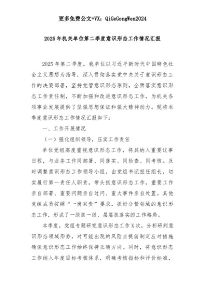 【七哥公文】2025年:【七哥公文】2025年机关单位第二季度意识形态工作情况汇报+更多免费公文+VX:QiGeGongWen2024+更多免费公文+VX:QiGeGongWen2024