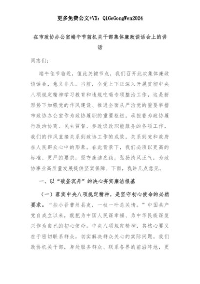 【七哥公文】2025年:【七哥公文】在市政协办公室端午节前机关干部集体廉政谈话会上的讲话+更多免费公文+VX:QiGeGongWen2024+更多免费公文+VX:QiGeGongWen2024