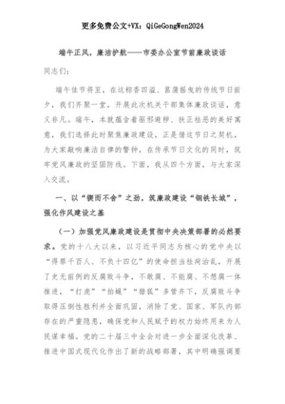 【七哥公文】2025年:【七哥公文】端午正风,廉洁护航——市委办公室节前廉政谈话+更多免费公文+VX:QiGeGongWen2024+更多免费公文+VX:QiGeGongWen2024