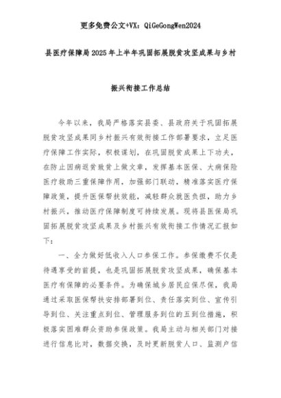 【七哥公文】2025年:【七哥公文】县医疗保障局2025年上半年巩固拓展脱贫攻坚成果与乡村振兴衔接工作总结+更多免费公文+VX:QiGeGongWen2024+更多免费公文+VX:QiGeGongWen2024