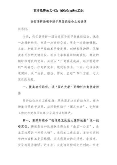 【七哥公文】2025年:【七哥公文】在街道新任领导班子集体谈话会上的讲话+更多免费公文+VX:QiGeGongWen2024+更多免费公文+VX:QiGeGongWen2024