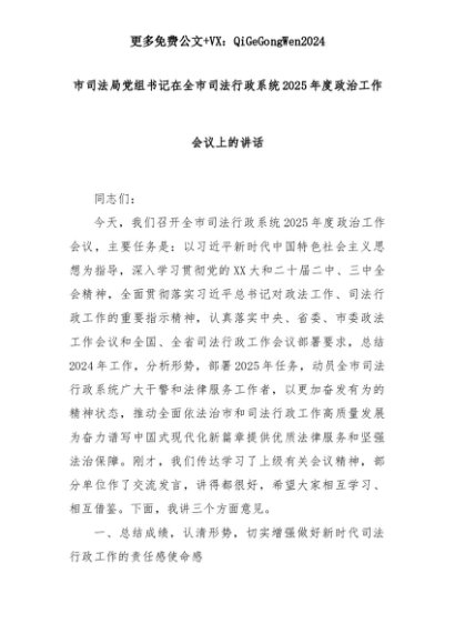 【七哥公文】2025年:【七哥公文】市司法局党组书记在全市司法行政系统2025年度政治工作会议上的讲话+更多免费公文+VX:QiGeGongWen2024+更多免费公文+VX:QiGeGongWen2024