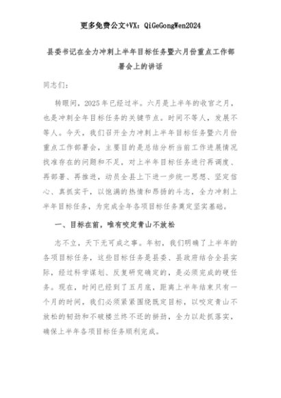 【七哥公文】2025年:【七哥公文】县委书记在全力冲刺上半年目标任务暨六月份重点工作部署会上的讲话+更多免费公文+VX:QiGeGongWen2024+更多免费公文+VX:QiGeGongWen2024