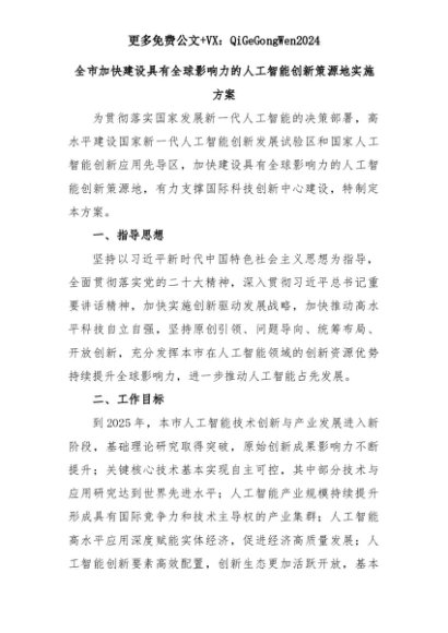 【七哥公文】2025年:【七哥公文】全市加快建设具有全球影响力的人工智能创新策源地实施方案+更多免费公文+VX:QiGeGongWen2024+更多免费公文+VX:QiGeGongWen2024