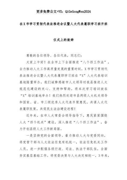 【七哥公文】2025年:【七哥公文】在X市学习贯彻代表法推进会议暨人大代表履职学习班开班仪式上的致辞+更多免费公文+VX:QiGeGongWen2024+更多免费公文+VX:QiGeGongWen2024