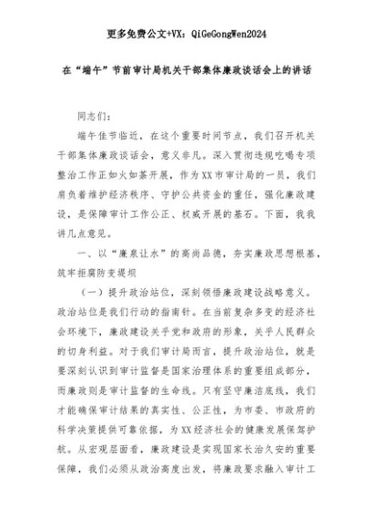 【七哥公文】2025年:【七哥公文】在“端午”节前审计局机关干部集体廉政谈话会上的讲话+更多免费公文+VX:QiGeGongWen2024+更多免费公文+VX:QiGeGongWen2024