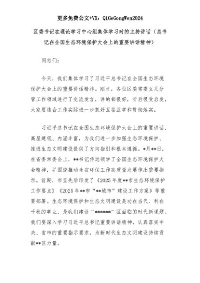 【七哥公文】2025年:【七哥公文】区委书记在理论学习中心组集体学习时的主持讲话(总书记在全国生态环境保护大会上的重要讲话精神)+更多免费公文+VX:QiGeGongWen2024+更多免费公文+VX:QiGeGongWen2024