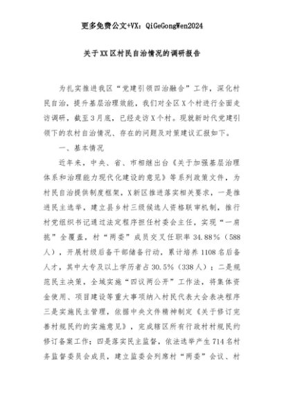 【七哥公文】2025年:【七哥公文】关于XX区村民自治情况的调研报告+更多免费公文+VX:QiGeGongWen2024+更多免费公文+VX:QiGeGongWen2024