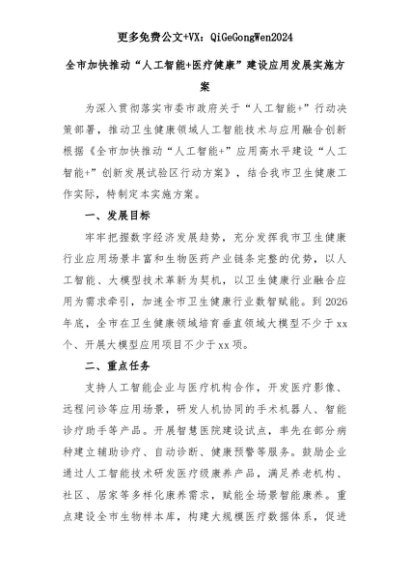 【七哥公文】2025年:【七哥公文】全市加快推动“人工智能+医疗健康”建设应用发展实施方案+更多免费公文+VX:QiGeGongWen2024+更多免费公文+VX:QiGeGongWen2024