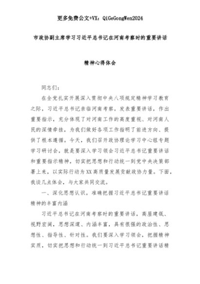 【七哥公文】2025年:【七哥公文】市政协副主席学习习近平总书记在河南考察时的重要讲话精神心得体会+更多免费公文+VX:QiGeGongWen2024+更多免费公文+VX:QiGeGongWen2024