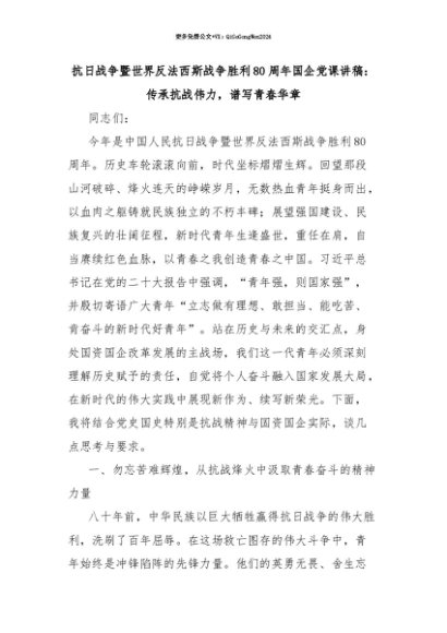 【七哥公文】2025年:【七哥公文】抗日战争暨世界反法西斯战争胜利80周年国企党课讲稿:传承抗战伟力,谱写青春华章+更多免费公文+VX:QiGeGongWen2024+更多免费公文+VX:QiGeGongWen2024