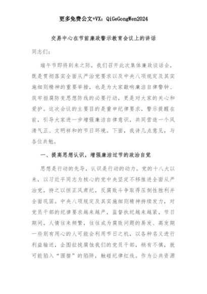 【七哥公文】2025年:【七哥公文】交易中心在节前廉政警示教育会议上的讲话+更多免费公文+VX:QiGeGongWen2024+更多免费公文+VX:QiGeGongWen2024