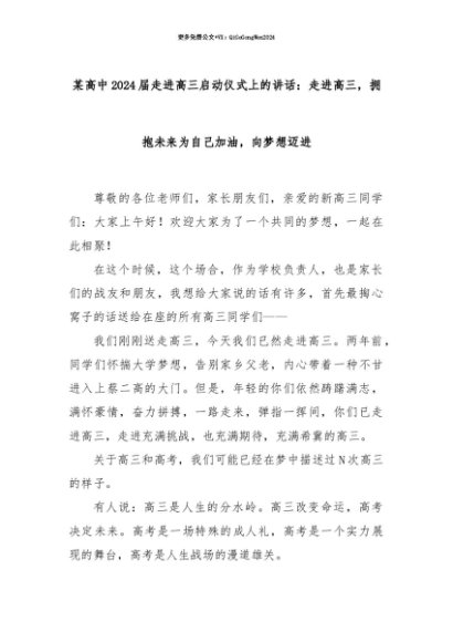 【七哥公文】2025年:【七哥公文】某高中2024届走进高三启动仪式上的讲话:走进高三,拥抱未来为自己加油,向梦想迈进+更多免费公文+VX:QiGeGongWen2024+更多免费公文+VX:QiGeGongWen2024