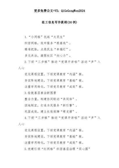 【七哥公文】2025年:【七哥公文】(30例)组工信息写作提纲+更多免费公文+VX:QiGeGongWen2024+更多免费公文+VX:QiGeGongWen2024