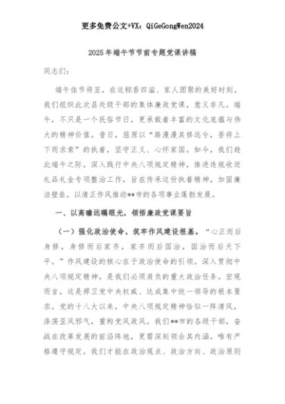 【七哥公文】2025年:【七哥公文】2025年端午节节前专题党课讲稿+更多免费公文+VX:QiGeGongWen2024+更多免费公文+VX:QiGeGongWen2024
