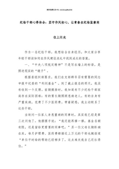 【七哥公文】2025年:【七哥公文】纪检干部心得体会:坚守作风初心,让青春在纪检监察岗位上闪光+更多免费公文+VX:QiGeGongWen2024+更多免费公文+VX:QiGeGongWen2024