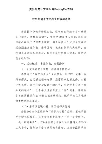 【七哥公文】2025年:【七哥公文】2025年端午节主题系列活动总结+更多免费公文+VX:QiGeGongWen2024+更多免费公文+VX:QiGeGongWen2024