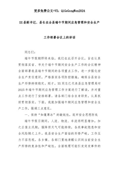 【七哥公文】2025年:【七哥公文】XX县副书记、县长在全县端午节期间应急管理和安全生产工作部署会议上的讲话+更多免费公文+VX:QiGeGongWen2024+更多免费公文+VX:QiGeGongWen2024