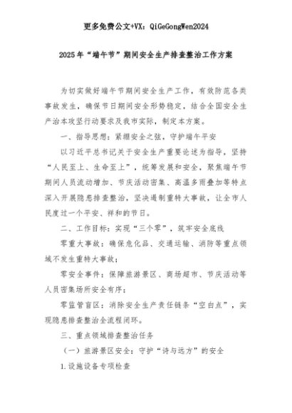 【七哥公文】2025年:【七哥公文】2025年“端午节”期间安全生产排查整治工作方案+更多免费公文+VX:QiGeGongWen2024+更多免费公文+VX:QiGeGongWen2024