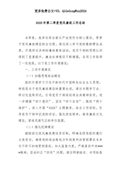 【七哥公文】2025年:【七哥公文】2025年第二季度党风廉政工作总结+更多免费公文+VX:QiGeGongWen2024+更多免费公文+VX:QiGeGongWen2024
