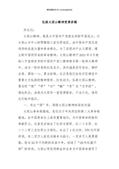 【七哥公文】2025年:【七哥公文】弘扬大别山精神党课讲稿+更多免费公文+VX:QiGeGongWen2024+更多免费公文+VX:QiGeGongWen2024