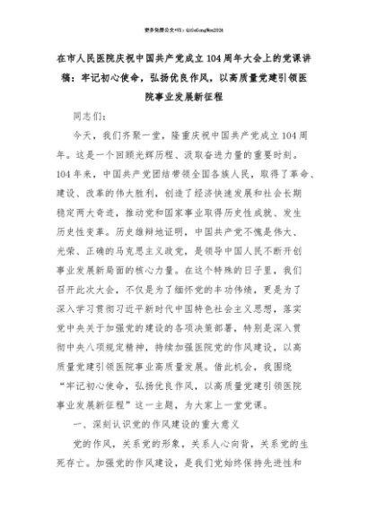 【七哥公文】2025年:【七哥公文】在市人民医院庆祝中国共产党成立104周年大会上的党课讲稿:牢记初心使命,弘扬优良作风,以高质量党建引领医院事业发展新征程+更多免费公文+VX:QiGeGongWen2024+更多免费公文+VX:QiGeGongWen2024