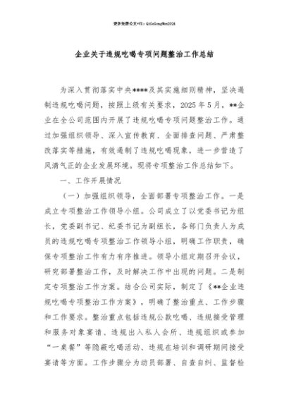 【七哥公文】2025年:【七哥公文】企业关于违规吃喝专项问题整治工作总结+更多免费公文+VX:QiGeGongWen2024+更多免费公文+VX:QiGeGongWen2024