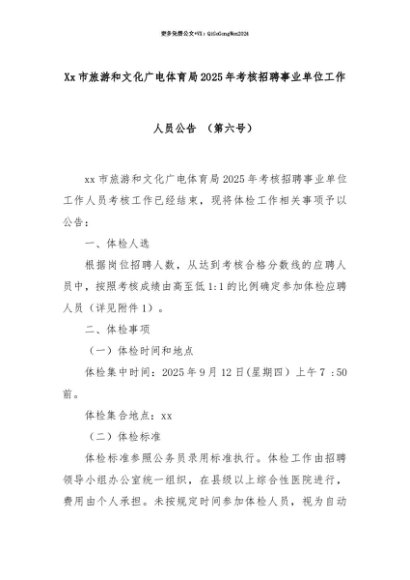 【七哥公文】2025年:【七哥公文】Xx市旅游和文化广电体育局2025年考核招聘事业单位工作人员公告 (第六号)+更多免费公文+VX:QiGeGongWen2024+更多免费公文+VX:QiGeGongWen2024
