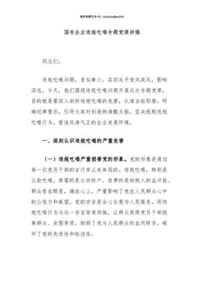 【七哥公文】2025年:【七哥公文】国有企业违规吃喝专题党课讲稿+更多免费公文+VX:QiGeGongWen2024+更多免费公文+VX:QiGeGongWen2024