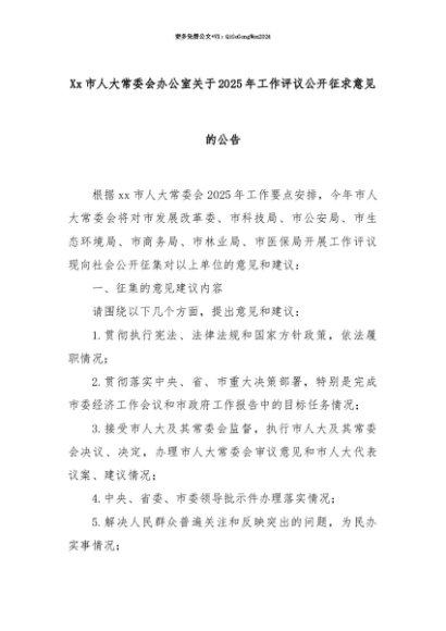 【七哥公文】2025年:【七哥公文】Xx市人大常委会办公室关于2025年工作评议公开征求意见的公告+更多免费公文+VX:QiGeGongWen2024+更多免费公文+VX:QiGeGongWen2024
