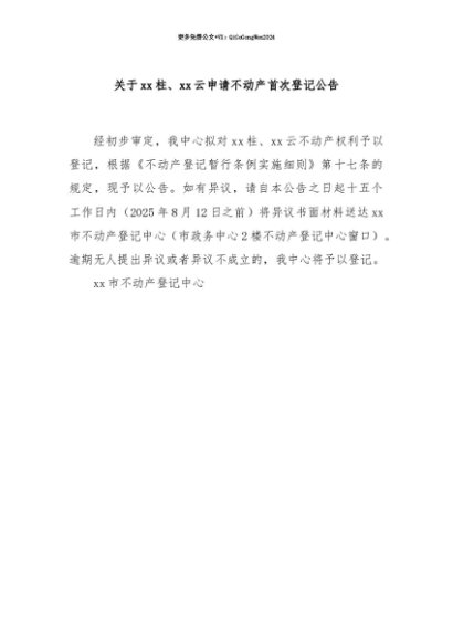 【七哥公文】2025年:【七哥公文】关于xx柱、xx云申请不动产首次登记公告+更多免费公文+VX:QiGeGongWen2024+更多免费公文+VX:QiGeGongWen2024