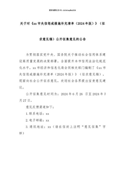 【七哥公文】2025年:【七哥公文】关于对《xx市失信惩戒措施补充清单(2024年版)》(征求意见稿)公开征集意见的公告+更多免费公文+VX:QiGeGongWen2024+更多免费公文+VX:QiGeGongWen2024