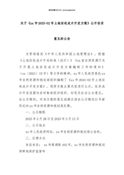 【七哥公文】2025年:【七哥公文】关于《xx市2025-02号土地征收成片开发方案》公开征求意见的公告+更多免费公文+VX:QiGeGongWen2024+更多免费公文+VX:QiGeGongWen2024