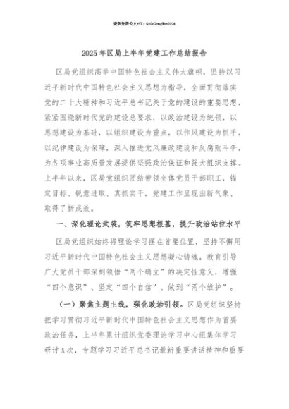 【七哥公文】2025年:【七哥公文】2025年区局上半年党建工作总结报告+更多免费公文+VX:QiGeGongWen2024+更多免费公文+VX:QiGeGongWen2024