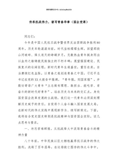 【七哥公文】2025年:【七哥公文】传承抗战伟力,谱写青春华章(国企党课)+更多免费公文+VX:QiGeGongWen2024+更多免费公文+VX:QiGeGongWen2024