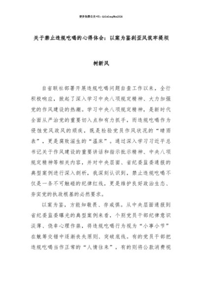 【七哥公文】2025年:【七哥公文】关于禁止违规吃喝的心得体会:以案为鉴刹歪风筑牢堤坝树新风+更多免费公文+VX:QiGeGongWen2024+更多免费公文+VX:QiGeGongWen2024