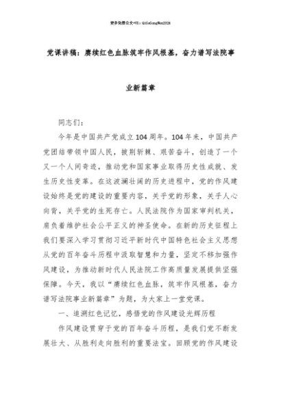 【七哥公文】2025年:【七哥公文】党课讲稿:赓续红色血脉筑牢作风根基,奋力谱写法院事业新篇章+更多免费公文+VX:QiGeGongWen2024+更多免费公文+VX:QiGeGongWen2024