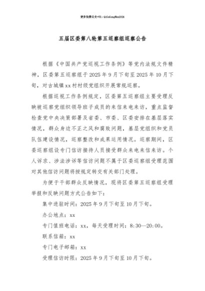 【七哥公文】2025年:【七哥公文】五届区委第八轮第五巡察组巡察公告+更多免费公文+VX:QiGeGongWen2024+更多免费公文+VX:QiGeGongWen2024