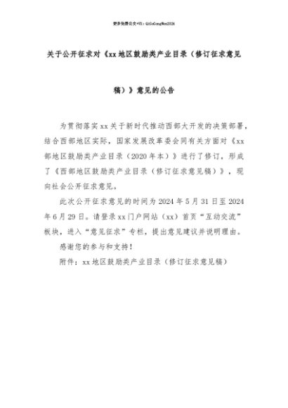 【七哥公文】2025年:【七哥公文】关于公开征求对《xx地区鼓励类产业目录(修订征求意见稿)》意见的公告+更多免费公文+VX:QiGeGongWen2024+更多免费公文+VX:QiGeGongWen2024