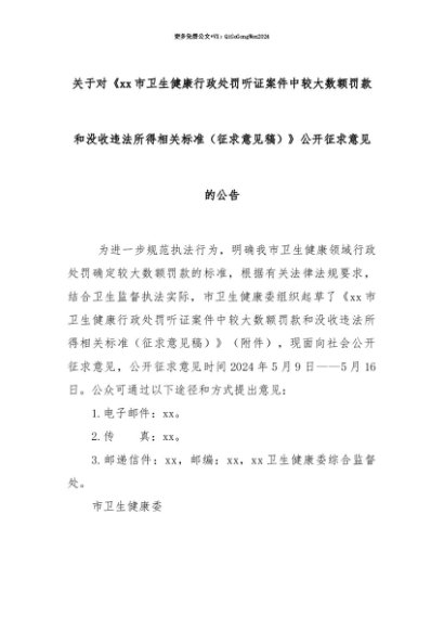 【七哥公文】2025年:【七哥公文】关于对《xx市卫生健康行政处罚听证案件中较大数额罚款和没收违法所得相关标准(征求意见稿)》公开征求意见的公告+更多免费公文+VX:QiGeGongWen2024+更多免费公文+VX:QiGeGongWen2024