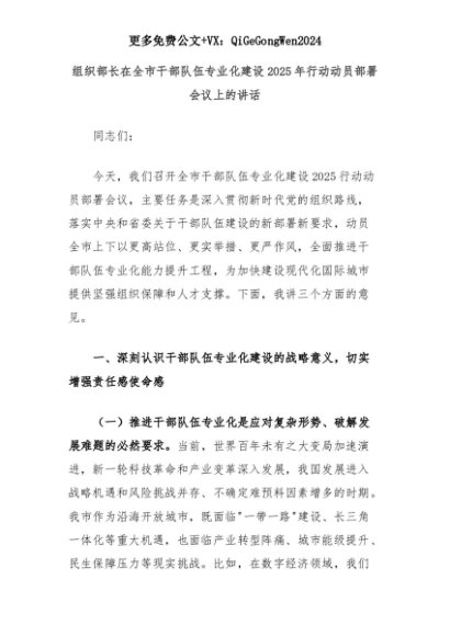 【七哥公文】2025年:【七哥公文】组织部长在全市干部队伍专业化建设2025年行动动员部署会议上的讲话+更多免费公文+VX:QiGeGongWen2024+更多免费公文+VX:QiGeGongWen2024