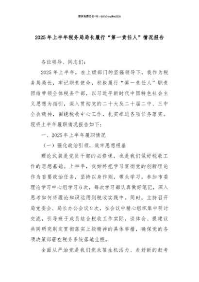 【七哥公文】2025年:【七哥公文】2025年上半年税务局局长履行“第一责任人”情况报告+更多免费公文+VX:QiGeGongWen2024+更多免费公文+VX:QiGeGongWen2024