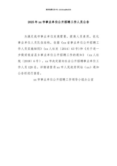 【七哥公文】2025年:【七哥公文】2025年xx市事业单位公开招聘工作人员公告+更多免费公文+VX:QiGeGongWen2024+更多免费公文+VX:QiGeGongWen2024