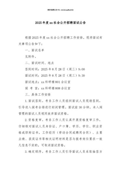 【七哥公文】2025年:【七哥公文】2025年度xx社会公开招聘面试公告+更多免费公文+VX:QiGeGongWen2024+更多免费公文+VX:QiGeGongWen2024