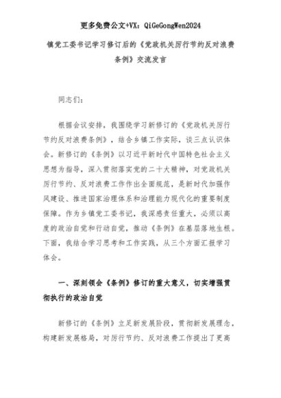 【七哥公文】2025年:【七哥公文】镇党工委书记学习修订后的《党政机关厉行节约反对浪费条例》交流发言+更多免费公文+VX:QiGeGongWen2024+更多免费公文+VX:QiGeGongWen2024