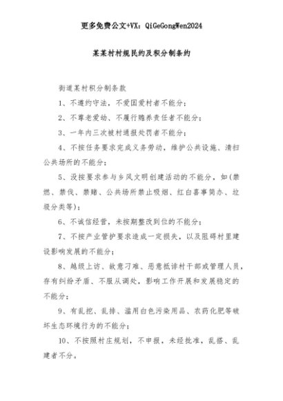 【七哥公文】2025年:【七哥公文】某某村村规民约及积分制条约+更多免费公文+VX:QiGeGongWen2024+更多免费公文+VX:QiGeGongWen2024