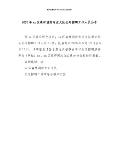 【七哥公文】2025年:【七哥公文】2025年xx区森林消防专业大队公开招聘工作人员公告+更多免费公文+VX:QiGeGongWen2024+更多免费公文+VX:QiGeGongWen2024