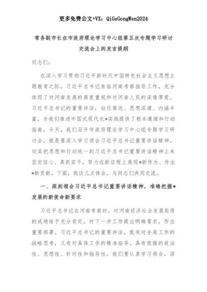【七哥公文】2025年:【七哥公文】常务副市长在市政府理论学习中心组第五次专题学习研讨交流会上的发言提纲+更多免费公文+VX:QiGeGongWen2024+更多免费公文+VX:QiGeGongWen2024
